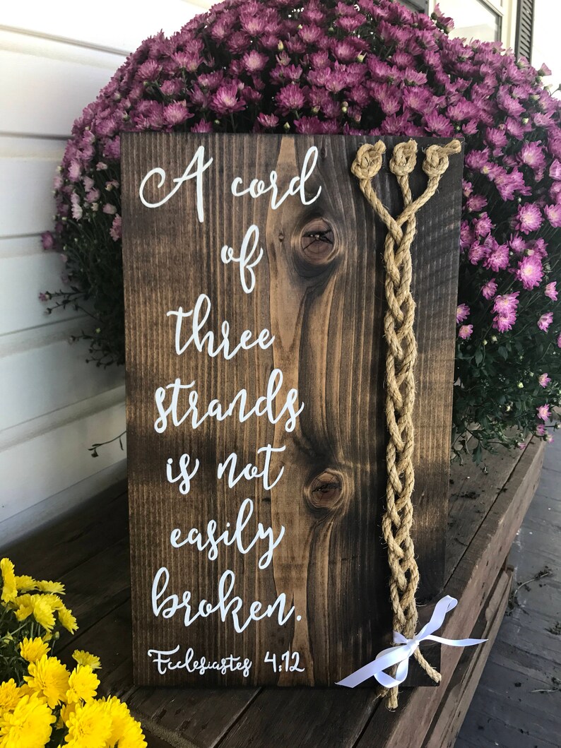 A cord of three strands is not easily broken sign unity ... from i.etsystatic.com Each sign comes ready to hang. In the film, the minister reminds the leading couple that a husband is one cord, a. A cord of three strands is not easily broken wood sign. Ecclesiastes 4:10 says a cord of 3 strands is not easily broken. the bible tells us what this means, and how we should apply it to our lives. A cord of three strands is not easily broken. A cord of three strands is not quickly broken. A cord of three strands is not quickly torn apart. With the guidance of the incentive awards program and.